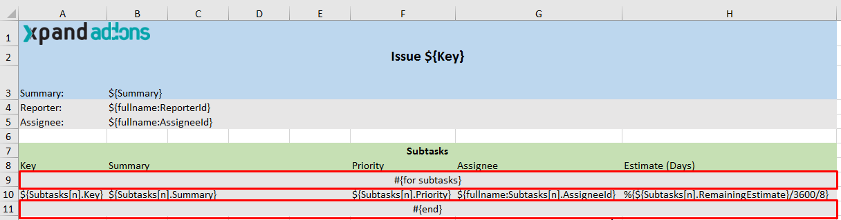 ${Summary}, ${ReporterUserName} and ${AssigneeUserName} are examples of mappings similar to the ones used on Word templates.