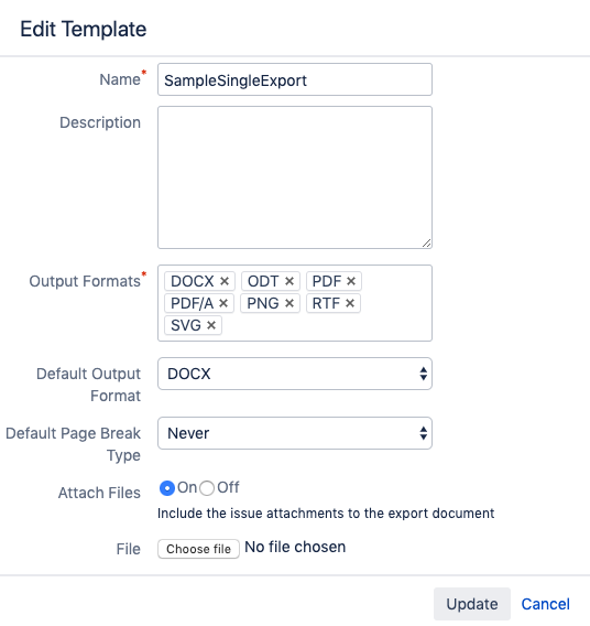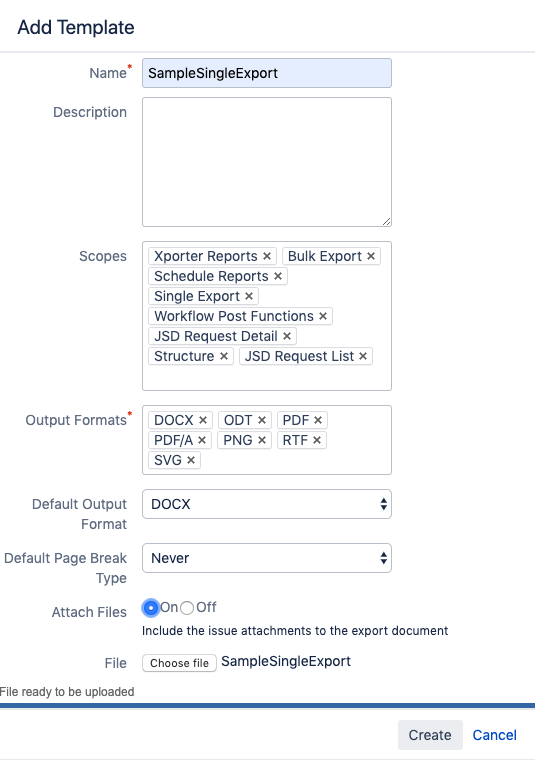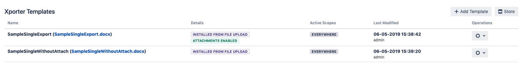 After adding/editing the template, the Xporter for Jira Templates page will indicate which templates have the attachments enabled.