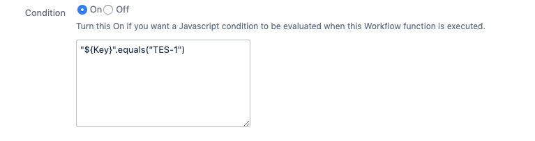 Then, write your JavaScript condition on the text box. Please remember that if you activate this option, your Post Function will only be executed if the JavaScript expression is evaluated to be a True statement.