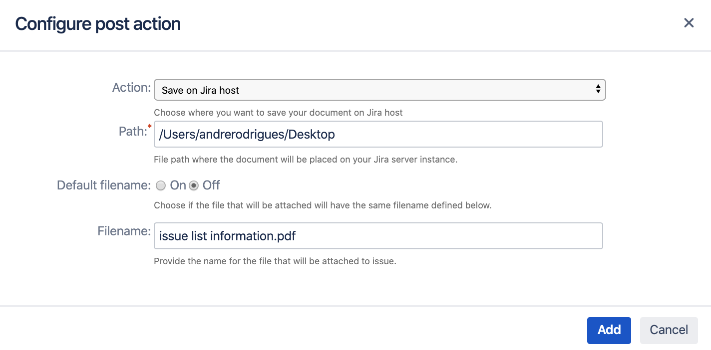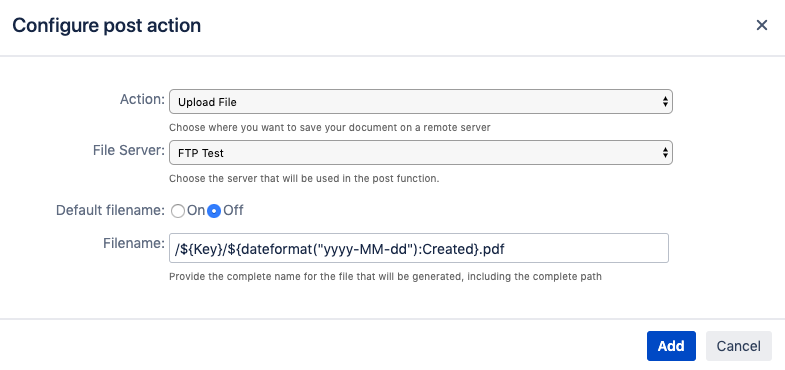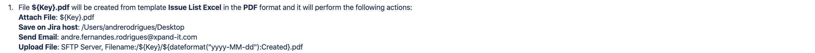 The Xporter Post Function allows you to generate a document during transitions in JIRA Workflows and to define which actions you want to perform.