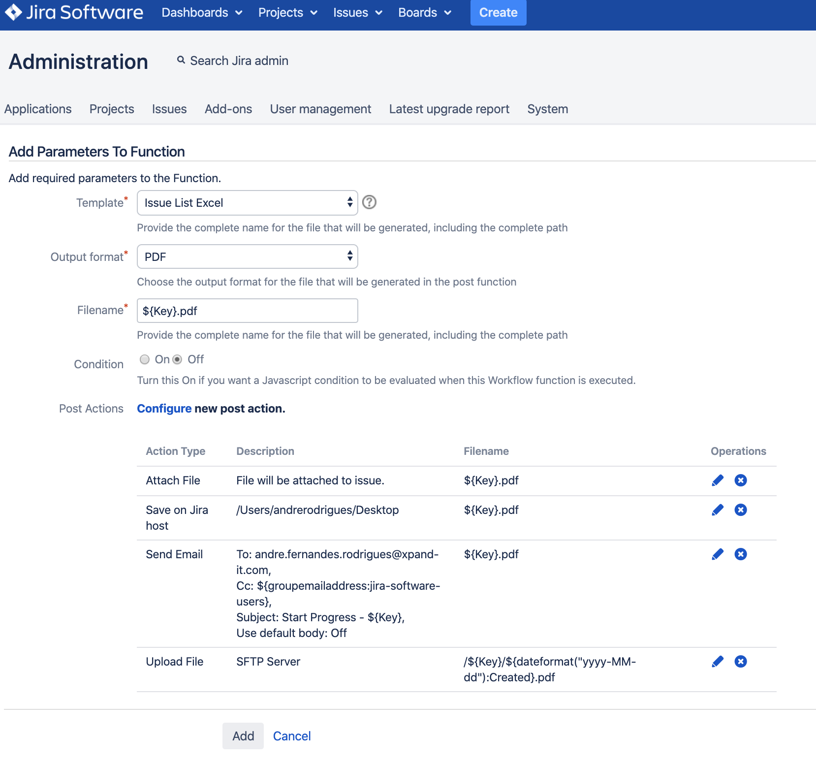 That´s it. For this example, every time I make a Status transaction on an issue, Xporter will check if the Issue Key is "TEST-1" and if it is, it will execute this Post Function.