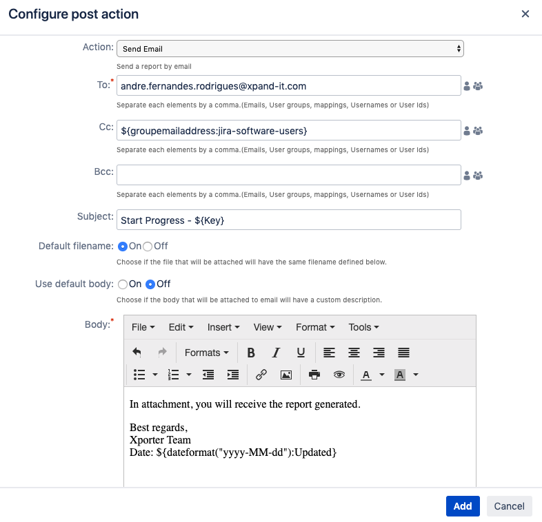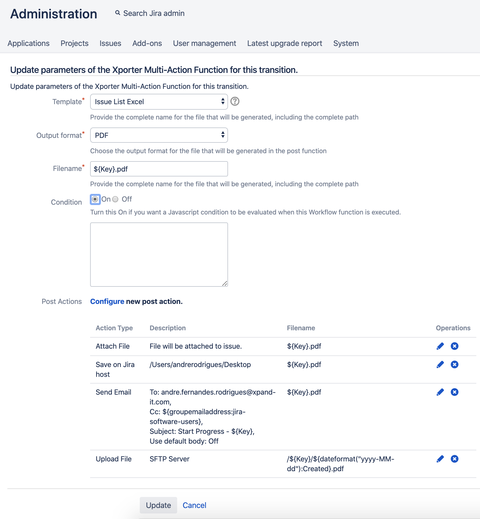 Xporter provides a Workflow Post Function that allows administrators to define multiple actions that will be performed during transitions in Jira Workflows.