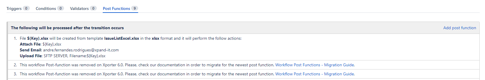 After upgrading the post functions and performing the Upgrade for the latest version of Xporter, the oldest post functions will be deprecated.