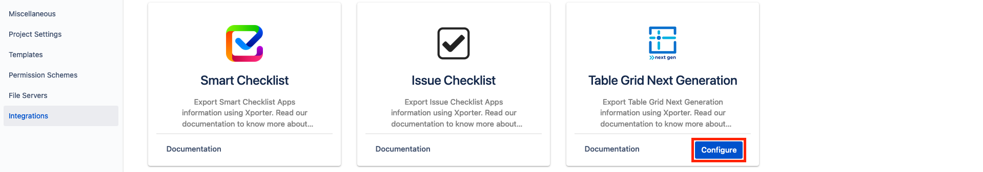- Go to the Integrations page, in the Xporter Tab, and in the Table Grid Next Generation card click in "Configure";